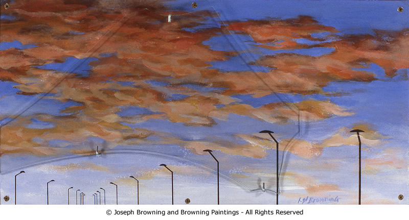 My high school friend's father who bought this loved the subject as he knew exactly where I derived the image from and also was intimately familiar with the same dusk cloudscape as depicted. When I said the final composition would include a broken piece of window glass, as if from a car windshield, he immediately attributed this idea to my near death encounter with the Loma Prieta earthquake as written about herein regarding Painting No. 039 Post-Earthquake Freeway Driving Home While Bella Courts Dali With Smiles. And that attribution really sold him on the painting. While I was happy that I had made another sale and to a man whom I greatly admired, I was also quite aware of the fact that this particular painting was really a departure from the various styles of work I had previously done. And I immediately understood that this buyer appreciated this direct and obvious subject matter more than my complex abstracted surrealism creations. And this fact made me smile because of it's pure truth: sometimes less is more and sometimes simple and clear is received better than complex and abstract.